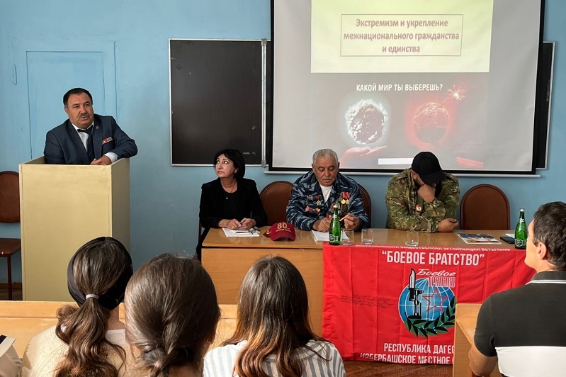 В рамках реализации проекта «Профилактика экстремизма, гармонизация межэтнических отношений и укрепление патриотических чувств учащихся в средне-специальных учебных заведениях Республики Дагестан» декан технологического факультета, ДРО «Боевое Братство» Мусашейх Салманов встретился со студентами Профессионально-педагогического колледжа имени М.М. Меджидова (г. Избербаш).